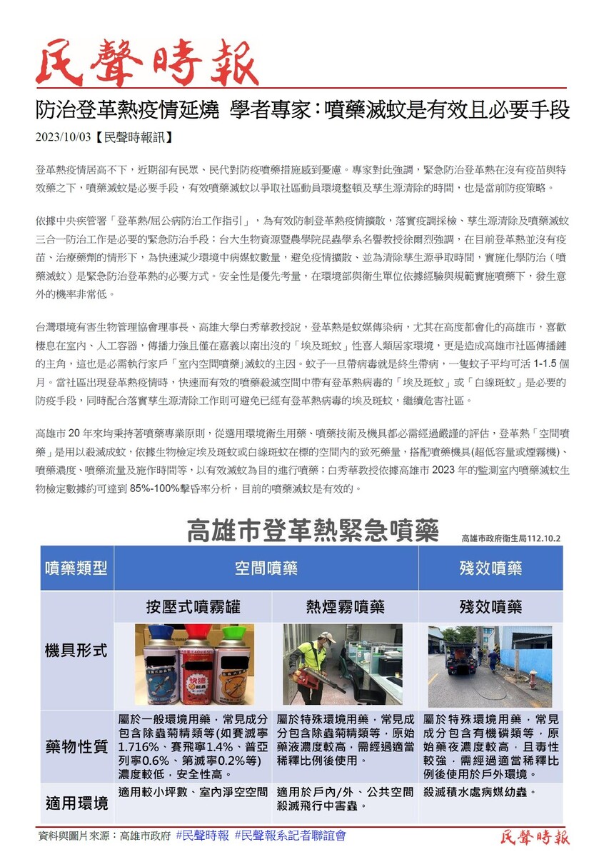 防治登革熱疫情延燒 學者專家:噴藥滅蚊是有效且必要手段 【民聲時報訊】2023/10/03