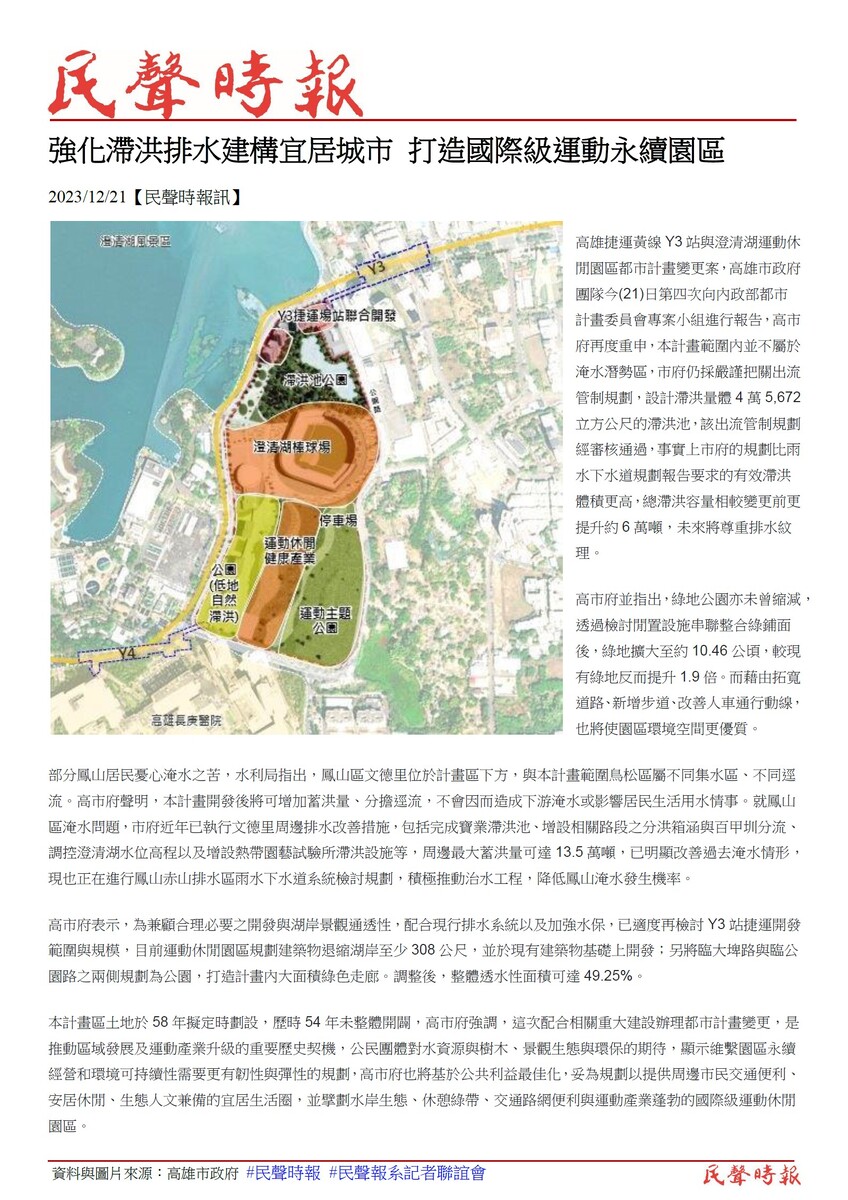 強化滯洪排水建構宜居城市 打造國際級運動永續園區 【民聲時報訊】2023/12/21